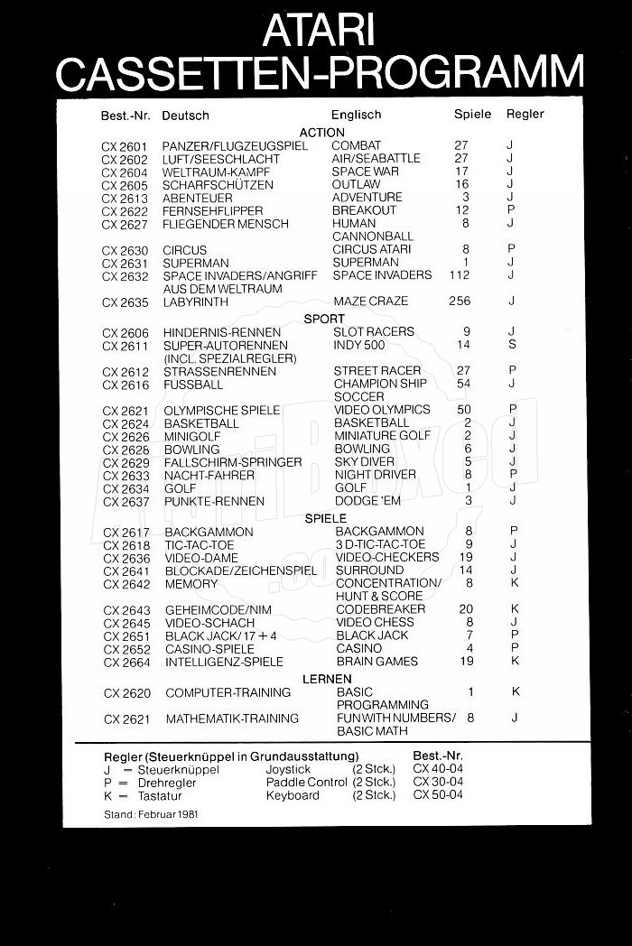 Atari Inc.- the company all began with- started to release their first VCS titles in the U.S. in spetember 1977 . The official release in Europe followed in 1980. The german company Unimex in Wiesbaden was the first distributor for Atari games in 1980-1983 under the Time Warner era in Europe. |