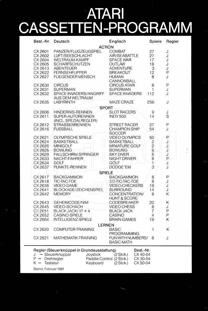 Atari Inc.- the company all began with- started to release their first VCS titles in the U.S. in spetember 1977 . The official release in Europe followed in 1980. The german company Unimex in Wiesbaden was the first distributor for Atari games in 1980-1983 under the Time Warner era in Europe. |